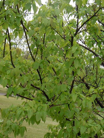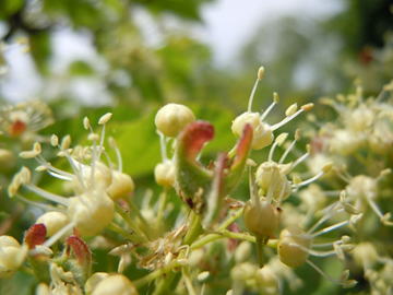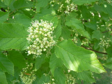 タタールカエデはムクロジ科(←カエデ科)の落葉樹である。樹高は4~12m程度となる。樹皮は薄く、薄茶色であり、若木の内は平滑であるが、年を経ると樹皮は浅裂する。葉は、長さ4.5~10㎝、幅3~7㎝程度の楕円状で縁部は3~5浅裂する。葉の表面は光沢の無い緑色で、縁部には不規則な粗鋸歯がある。葉には、長さ2~5㎝程度で桃色の葉柄がつき、枝に対生する。春、葉の展開とほぼ同時期に枝先の葉腋に5~8㎜程度で白色を帯びた花をつける。果実は、2~3㎝程度の翼を持った長さ10~12㎜程度で赤味を帯びた翼果で晩夏から初秋に熟す。 | |