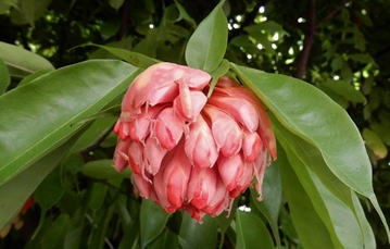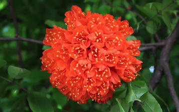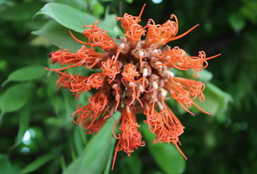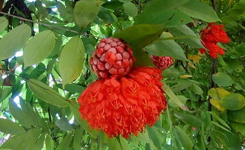 オオホウカンボクは、マメ科の常緑樹である。樹高は、概して5m前後程度であるが、原産地では20mにも達することがあると言う。本種の属するブラウネア属の中でも最大の集合花を見せてくれる。花径全体は、12㎝前後程度であるが、この花のまとまりの中に、実際の花が100個以上も集合している。開花は、外側から中央部へと咲き進む。開花期間は、3日程度と言うことであり、開花期に目にすることが少ないと言われている。 | |