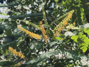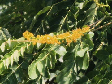 ナンバンアカアズキは、マメ科の落葉樹である。樹高は10~20m程度に。葉は2回羽状複葉で対生し、羽片は4~6対、小葉は6~10対で、互生する。原産地では、2~3月頃、葉腋から穂状の花序を出し、黄色い5弁の小花を密生させる。花には芳香がある。莢果の長さは15~20㎝程度で、開裂し湾曲して反り返る。中には、光沢があり鮮紅色の種子を10~12個内包する。 | ||