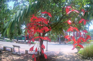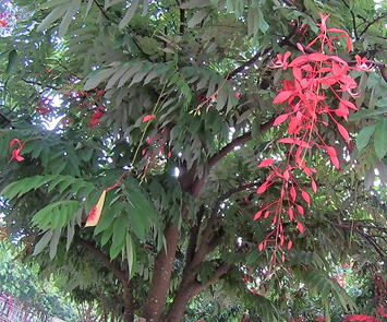 ヨウラクボクはマメ科の常緑樹である。樹高は10~15m程度となる。葉は偶数羽状複葉で、小葉は長さ20~30㎝程度の披針形で、6~8対つく。本種の場合、新葉が鮮やかな紅赤色で長く下垂するのが特徴的である。原産地では1~2月頃に開花する。葉腋から長い総状花序を下垂し、深紅の5弁花を多数つける。花弁は上3個が、長さ7.5㎝程度と長く、下の2個はとても細く短くなる。花の中心部には9~10個の雄蕊があり、その中心部に長い雌蕊があり、どちらの蕊も長く花から突き出る。花後には、長さ10~20㎝程度の莢果をつけ、4~6個程度の種子を内包する。本種は、原産地ミャンマーでも希な存在で、ほんの数回しか自生種を確認出来ていないという。 | |