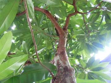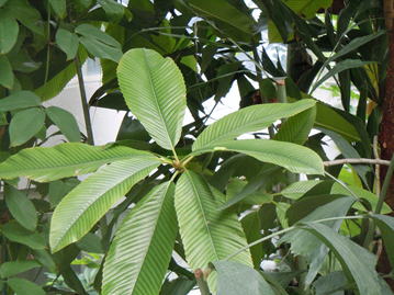 ビワモドキは、ビワモドキ科の落葉樹である。樹高は10m程度に。樹皮は赤褐色で部分的に剥がれ落ちる。葉は長さ40㎝前後、幅15㎝程度の長楕円形で、表面には平行脈が目立つ。葉は革質で、表面には光沢があり、縁には鋸歯がある。花は経15~20㎝程度の大型の白色5弁花で芳香を有する。果実は径15㎝程度の球形。果実は酸味の強い多汁質で、食用とされる。我が国での園芸界では葉の美しさから観葉植物としても流通している。 | |