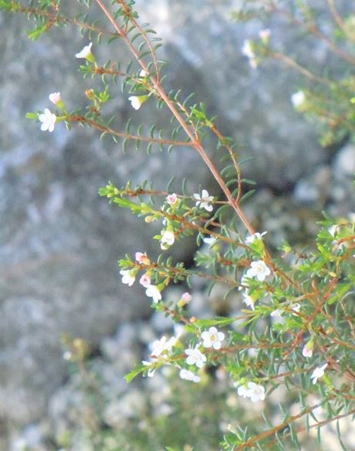 エレモフィラ・ラケモサはゴマノハグサ科の常緑樹である。本種は、西オーストラリア州南西部乾燥地帯に自生する灌木である。。樹高は1.5m程度となる。葉は、長さ18~43㎜、幅2~6㎜程度の線状で、枝に互生する。原産地のオーストラリアでは12~3月に開花する。花は茎頂部並びに枝先の葉腋に総状花序を出し、長さ1.5~.㎝の筒状花で、花冠径は1㎝程度で、花冠は4裂する。花筒上部はオレンジ色で、下部は黄色となるか、すべて白色の花をつける。花後には、直径9~13㎜程度で球形の果実をつけ表面に灰白色の斑点模様が入る。 | ||