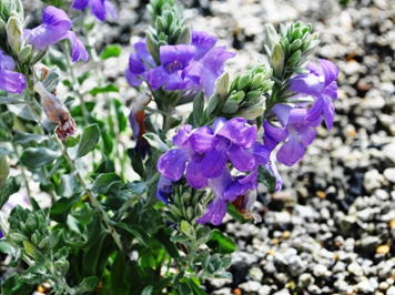 | 解説 | エレモフィラ・トビーベルは、ゴマノハグサ科の常緑樹である。エレモフィラ属はオーストラリアに200種以上原生する常緑樹であり、樹高2m前後の灌木である。我が国ではエレモフィラ・ニヴェア種が園芸界で流通しているのでお馴染みである。本種は、そのエレモフィラ属から我が国で作出されたハイブリッド種である。前記エレモフィラニヴェア種が春咲きの一期咲き種であるに対して本種は四季咲き性となる。樹高は0.5~1.5m程度に。葉も茎も銀白色の毛に覆われているが、ニヴェア種と比して樹木を覆う白色の短毛はの稜は少なく緑がちとなる。花は径2㎝程度の紫青色である。ニヴェア種と同様に本種も「ホワイトツリー」の名を持つ。 | ||
