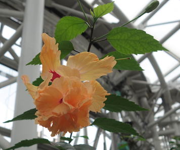 エル・カピトリオはアオイ科の常緑樹である。樹高は1~2m程度。葉は楕円形で、縁には鋸歯を持ち、先端は鋭頭、枝に互生する。本種はフウリンブッソウゲ(Hibiscus schizopetalus)を母種として作出された園芸品種である。本種は、黄色で、「イエロー・エル・カピトリオ・スポルト」であるが、同形の花形で赤色の「エル・カピトリオ(El Capitlio」に対する命名。本種は、母種のフウリンブッソウゲの花形を受け継ぎ、雄蘂が花弁化して、2段に開花しているような姿を見せる。開花期は周年と言うことである。 | |