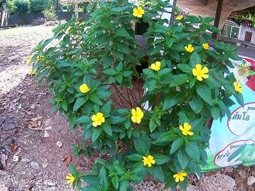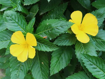 ターネラ・ウルミフォリアは、トケイソウ科の常緑亜低木である。樹高は1m前後に。葉は濃緑色で形状は長楕円形。葉の縁には不規則な鋸歯が見られる。花色は鮮黄色で、花径5㎝前後。花は、陽光を浴びると開花し、午後には閉じてしまうが、翌朝また開花する。我が国の園芸界ではイエロー・クィーンの名で流通しているようである。 | ||