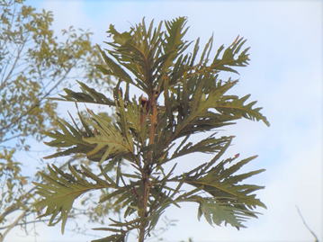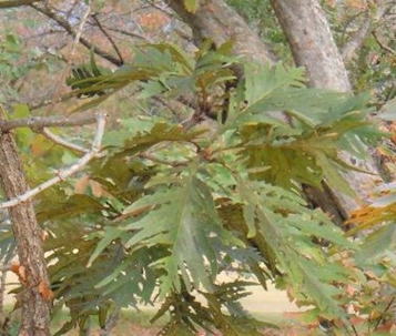 ハゴロモガシワは、ブナ科の落葉樹である。本種は、カシワから作出された園芸品種である。樹高については不詳。因みに母種のカシワは15m以上にも達する。若枝には軟毛が密生する。葉は長さ25㎝程度の楕円形であるが、縁部が主脈近くまで細多深裂するので、裂片の様子からイトガシワとも呼ばれる。深裂数は10個以上で、先端部は鋭頭となる。 | ||