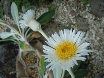 オレアリア・インシグニスはキク科の常緑低木である。本種は、ニュージーランド南島北東部のマールボロ地区にのみ自生する樹種である。樹高は1m程度までとなる。葉は、革質で、長さ7.5~17.5㎝程度の楕円状で、縁部は全縁、先端部は円頭、基部では長い葉柄に連なり茎に対生する。若葉の内は白色の細毛が葉を覆うが、やがて成葉になると光沢を見せるようになる。葉の下面は白色~薄茶色の網目模様となる。原産地では、6~8月頃開花する。茎頂並びに枝先から長い花柄を伸ばし、その先に径5.5㎝程度の頭花をつける。舌状花は白色で中央部の筒状花は黄色となる。 | ||