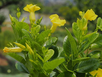 ペンタリノン・ルテウムはキョウチクトウ科の蔓性常緑樹である。蔓長は3~5m程度となる。葉は楕円状で、縁部は全縁、先端部は鈍頭、基部は短い葉柄に連なり蔓に対生する。6~11月頃、葉腋に集散花序を出し、径6~7㎝程度で黄色い筒状花をつける。花冠は5裂する。本種の蔓を切ると白色の乳液(Urchitoxin)が出て、皮膚に接すると刺激痛がある。因みに、旧属名のUrechitesの語源はラテン語のurens(=刺すような、ひりひりする)の意を持つ。 | |
