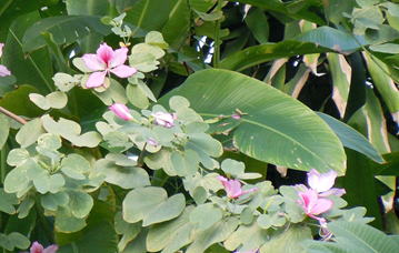 ムラサキソシンカはマメ科の落葉樹である。樹高は2~3m程度に。葉は心臓形で中裂し、枝に互生する。その中裂した葉姿がヒツジの蹄を連想させることから「羊蹄木」とも呼ばれる。因みに、中国名は「羊蹄甲」である。葉は全縁で、長い葉柄を持つ。原産地では10~11月頃に径7㎝前後程度の花を見せる。花色は淡桃色~紫桃色と変化があるが白色のものは見られない。 | |