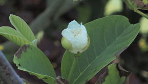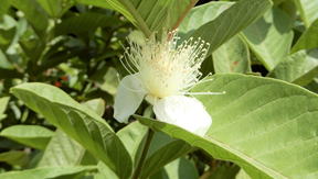 バンジロウは、フトモモ科の常緑樹である。樹高は5~9m程度に。樹皮は剥げやすく滑らかで紅褐色。葉は対生し、長楕円形裏面に柔毛を密生させる。5~7月頃白色の花を見せる。花径2.5㎝前後。果実は球形、或いは洋ナシ形で、8,9月頃黄色く熟す。果実には幾分酸味があり、麝香の臭いがする。本種の内で、果肉の赤いものは「スイカ・グアバ」、果実が丸いものは「アップル・グアバ」、実の大きなものは「キング・グアバ」と呼ばれている。 | ||