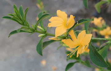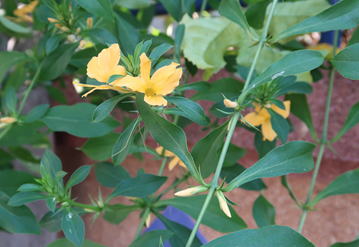 バルレリア・プリオニティスはキツネノマゴ科の常緑樹である。樹高は1.7m程度となる。葉は、長さ4~10.5㎝、幅1.8~5.5㎝の楕円形~卵形で、、全縁、鋭頭、基部は長さ1~2.5㎝程度の葉柄二連なり枝に対生する。葉柄の付け根には鋭い刺がある。葉の表面には光沢がある。10~12月頃、枝先に円筒状の苞を出し、そこから黄橙色の筒状花をつける。花冠は5裂し、花径は1㎝程度である。 | |