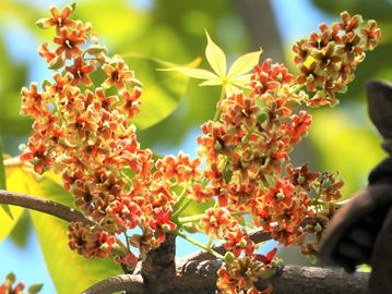 ヤツデアオギリは、アオイ科(←アオギリ科)の常緑樹である。原産地では樹高は最大40mにも達するという。葉は、名前の謂われとなっているようにヤツデに似た形状で、つまり掌形であり5~11裂する。本種の葉は遠目には、等しく我が国で観葉植物として愛培されているパキラにもにている。ただし、パキラに比して、本種の葉はとても柔らかい。花は、総状につき、花の外側は暗赤色で、内側は桃色で濃桃色のストライプが入る。花には、学名にもあるように悪臭がある。種子は黒色に熟し油脂分を多分に含む。 | |