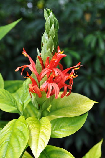 | 解説 | ベニサンゴバナは、キツネノマゴ科の常緑低木である。樹高は1~2m程度。葉は長さ10~20㎝の卵形~楕円形で茎に対生する。葉は、全縁で、先端部は鋭頭となる。葉の表面では葉脈が明瞭である。開花期は周年で、茎上部に穂状花序を出し、赤色で2唇型の花を多数つける。 | ||