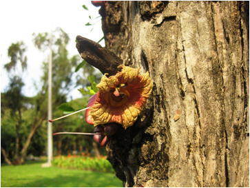 | 解説 | クレスケンティア・アラータは、ノウゼンカズラ科の常緑樹である。樹高は、5~8m程度に。樹皮は明るい褐色。花は夜開で、蝙蝠媒花である。花の径は、6㎝前後で、幹生花である。果実は、径7~10㎝程度の砲丸型で、中の果肉を取り除き容器や民芸品として利用する。 | 撮影地:タイ・アンパワー /ラマ2世記念公園↓ ![]() |