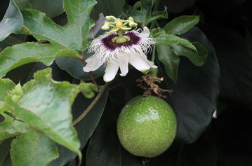クダモノトケイは、トケイソウ科の蔓性常緑樹である。葉は大きく10~18㎝程度で、葉柄の基部に一対の突起が見られる。花はトケイソウよりやや小さい。糸状になった副花冠の先端がよじれているのが特徴とされる。食用果実として最も適しているのは本種であり、所謂パッション・フルーツと呼ばれているのは本種である。 | |