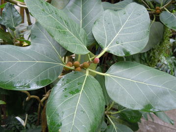 | 解説description | 葉は比較的大きく、卵形または楕円形。長さは10~20㎝。葉脈が黄緑色でよく目立つ。樹高は現地では30㍍にも達する。隠花は2個が対になって腋生し、赤熟する。枝からは気根を出し、大きな樹冠を形成する。 | ||