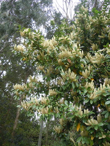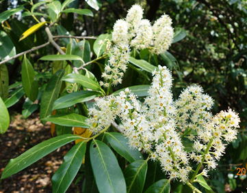 | 解説 | セイヨウバクチノキは、バラ科の常緑樹である。樹高は3~6m程度。葉は、長さ15㎝、幅6㎝程度の楕円形で、基部には短い葉柄を伴い、縁部には粗鋸歯があり、先端部は鈍頭で、枝に互生する。葉は幾分厚味が有り、表面には光沢がある。この木から採取した葉を水蒸気蒸留し、バクチ水を作り、それを鎮咳薬として利用する。花は、4~5月頃、前年枝~高さ10~12㎝程度の総状花序を立ち上げ、白色で、径1㎝程度の小花を多数つける。果実は長さ1~2㎝程度のほぼ球状で、暗紫色に熟する。 | ||