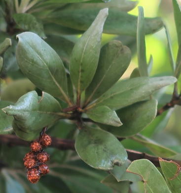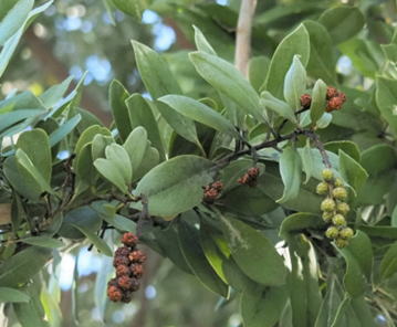 シバーボタンウッドは、シクンシ科の常緑樹である。典型的なマングローブ構成樹の1樹種である。原産地は中南米であるが、種子が漂流して、ハワイ、南米、アフリカ等では帰化状態にある。樹高は、15m程度に。葉は長楕円状で長さ5~10㎝程度。葉の表面は、学名にも見られるように絹糸状の白毛があり、質感はふんわりとしている。その関係で、樹木全体が、遠目にも白色を帯びて見える。花はあまり目立たないが、その後の茶褐色を帯びた円錐形の果実が枝状に残り名前の所以と化している。本種は、塩害にも強いく、幹の姿も美しいので、沿岸地域の新興都市などでは街路樹等に用いられている。反面、一例としてハワイ等では、根が強く、岩の割れ目に食い込んで、岩を割ってしまったり、景観を損なう有害帰化植物扱いを受けている。また本種は材質が緻密で、硬く、重く丈夫なことから、各種の用材にも用いられている。 | |