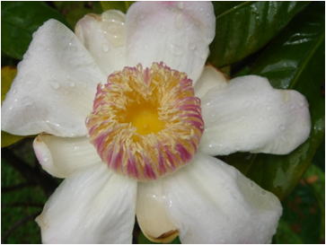 | 解説 | ヘヴン・ロータスは、サガリバナ科の常緑樹である。樹高は12m前後程度に。幹は直立し、分枝をせずに成長することが多く、しかも広線形の大きくて長い葉が幹頂周辺に集約されていることが多いので、遠目にはヤシの木のようにも見える。花は、白色の五弁花であり、写真に見られるように基部が紫紅色で先端が黄白色の雄蕊が無数に内巻きにカールしている。花には芳香が有り、蜜蜂、蝶、野鳥等が花時には好んでやってくる。果実は緑色から褐色へと熟すに従って色を変える。中に20個程度の種子が含まれている。黄橙色の果肉は蒸したり、米に混ぜて炊き込んだりして食用とするという。葉を煮詰めたものには幻覚作用や毒性があり矢毒や薬用としても用いられる。 | |
