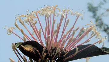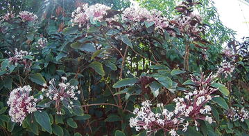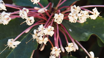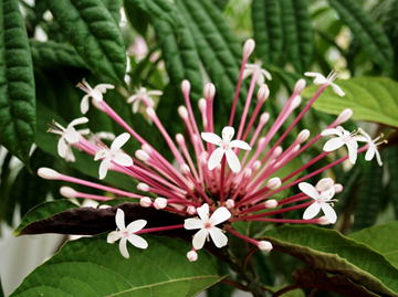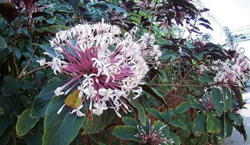 クレロデンドルムクアドリロクラレは、シソ科(←クマツヅラ科)の常緑樹である。樹高は2~5m程度に。葉は長い葉柄を持ち枝に対生し、楕円形もしくは狭倒卵形で、縁には荒い鋸歯が見られる。葉の表面は暗緑色で、葉脈(主脈・支脈)部位が下方に凹むために、全体的に凸凹感がある。葉の縁部は、緩やかに波を打つ。1~2月頃、枝先に集散花序を出し、白色の筒状花を多数放射状につける。掲載した写真に見られるように、桃紫色の花筒はとても長い。花冠は白色となり、5裂する。花後には楕円状の核果をつけ紫熟する。 | |