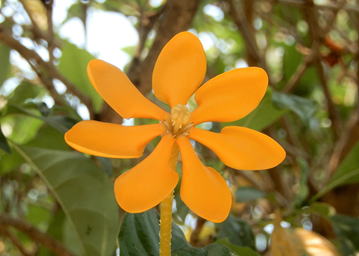 ハネミクチナシは、アカネ科の常緑樹である。樹高は5~6m程度に。葉は革質で、長楕円形、全縁、鋭頭、表面には光沢があり、枝に対生する。花は全開すると径10㎝程度の大きさとなる。咲き始めは白色で、やがてクリーム色を経て鮮黄色へと変化する。花には強い芳香がある。 | ||