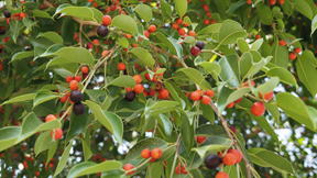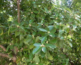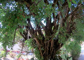 ガジュマルは、クワ科の常緑樹である。樹高は20mに及ぶ。幹は良く分枝をし、多くの気根を下垂する。葉は、長さ4~10㎝程度の楕円形で、全縁、鋭頭、枝に互生する。葉は肉質で、光沢がある。葉腋に掲載した写真に見られるようなイチジク状の実をつけ、中に多数の雄花並びに雌花を持つ。実の径は0.8㎝程度で、黄色~桃赤色に熟す。 | |