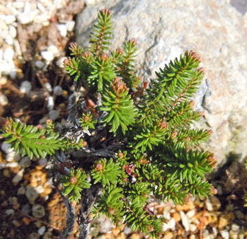 ガンコウランは、ツツジ科の常緑小低木である。概して高山帯の裸地に自生が見られる。茎は地上を匍匐枝、樹高は10~25㎝、葉はほぼ筒状で、枝に密に互生する。6~7月頃、葉腋に暗紅色の無花弁の小花を開く。果実は、7~8月頃紫黒色に熟す。果実は、多汁で、甘酸っぱい味がする。雌雄異株。 | |