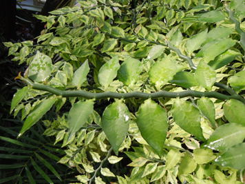 カギンリュウは、トウダイグサ科の低木状多肉植物である。英名にも見られるが、節ごとにジグザグに折れ曲がりながら成長する特徴を有している。葉は披針形で、全縁であるが、縁部は緩やかな波を打ち、先端部は尖り、茎に互生する。樹高は、30㎝~1.5m程度。本種は、茎に傷をつけると乳状の液体を出すが、皮膚に触れるとかぶれる。 | ||