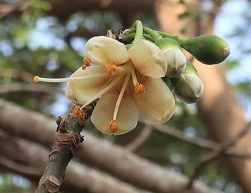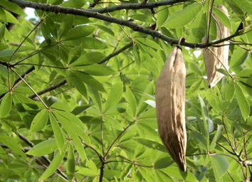 パンヤノキは、アオイ科の落葉樹である。樹高は30m程度となる。幼樹の幹肌は緑色であるがやがて灰色を帯びてくる。幼樹の幹や若枝には刺がある。枝は水平に輪生する。葉は掌状複葉で5~8個の小葉を持つ。1~3月頃開花する。枝先の葉腋に乳白色~白色の5弁花をつける。果実は、長さ15~20㎝程度の紡錘形の木質蒴果で、内部に長毛のある種子を多数内包する。 | |