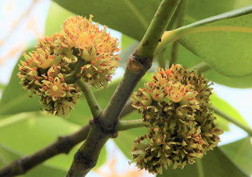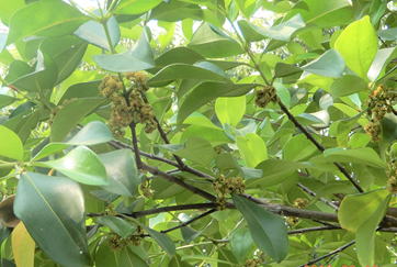 オカヒルギは、ヒルギ科の常緑樹である。本種は、原産地の項に記した諸地域、つまり、熱帯~亜熱帯地域でのモンスーン気候帯に自生する樹種である。語源の項とも重複するが、ヒルギ科の樹木は沿海地に自生するが、本種の場合、名前に示されるように内陸部に自生し、垂直分布は標高0~1800とかなりの高度差を持つ。樹高は最大50m程度にも及ぶと言うが、一般的に20m前後程度となる。樹皮は茶褐色で凹凸がある。葉は、長さ4~15㎝、幅2~10㎝程度の楕円形で、縁部は全縁、先端部は円頭、基部では短い葉柄に連なり枝に対生する。葉は革質で、濃緑色、裏面は茶色の葉点模様の入った黄緑色となる。1~2月頃、枝先の葉腋に短い(1~6㎝程度)の集散花序を出し、径3㎜程度で淡緑色~白色の椀形花を多数つける。花は無花弁で、萼片の先端部が6裂し、柱頭は花冠より突き出る。花後には、径7㎜程度の丸い果実をつけ赤熟する。多肉質な果肉内には種子が多数含まれる。 |
