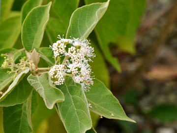 カリカルパ・アクミナータは、シソ科(←クマツヅラ科)の落葉樹である。樹高は6m程度となる。葉は短い柄を持った長さ15㎝程度の楕円状で縁は緩やかに波を打ち、先端部は尾状に尖い、枝に対生する。若枝並びに葉縁・葉裏には茶褐色の細毛が密生する。6~8月頃、枝先の葉腋から円錐花序を出し、紫色の小花を多数つける。花後の果実は径3㎜程度の球形で10月頃に濃紫色に熟す。果皮の表面には光沢がある。 | |