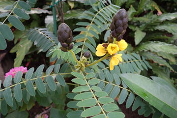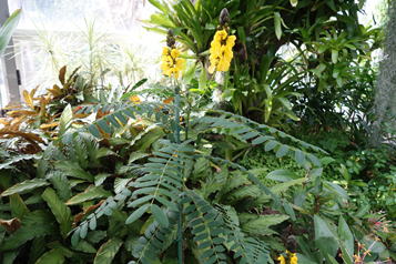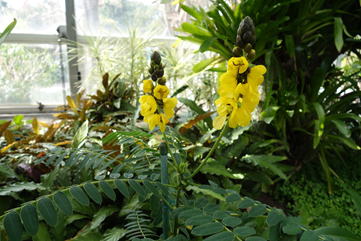解説description | フタホセンナは、マメ科の落葉樹である。樹高は2~4m程度となる。葉は長さ50㎝程度の羽状複葉で、枝に互生する。小葉は長さ6.5㎝程度の楕円状である。4~10月頃、茎先端~茎上部の葉腋から総状花序を2本出し、鮮黄色の5弁つける。花は、花茎に対して左右に開花する。花後の豆果は長さ12㎝程度で、12個の種子を内包する。 | |