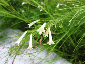 キバナハナチョウジはオオバコ科(←ゴマノハグサ科)の常緑樹である。樹高は1~2m程度。葉は細い針状で茎に対生する。我が国では5~9月頃に開花するが、熱帯地方では周年開花するという。花は、黄花で、長さ2.5㎝程度の筒状花である。花冠は4列する。非常に細い枝に多数の花をつけるものだから、写真に見られるように、枝そのものが垂れ下がってしまう。 | |