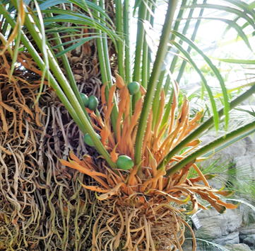 ナンヨウソテツはソテツ科の常緑樹である。樹高は6~12m程度となる。樹皮は灰色で、矩形からダイヤモンド型に剥離する。葉は長さ2.5~3m程度の羽状複葉で長さ35~60㎝程度の葉柄を持ち、幹に互生する小葉は、線形で、表面には強い光沢がある。各葉身に150~200個の小葉がつく。雄花序は長さ30~60㎝程度の卵形~紡錘状の円柱形で異臭を放つ。雌花序は茶色で長さ30㎝程度となる。果実は長さ4.5、幅3㎝程度の楕円状で緑色を経て橙色から赤褐色に熟す。 | |