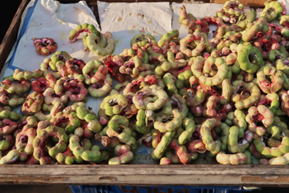 キンキジュはマメ科の常緑樹である。樹高は、10~15m程度に。葉は2回羽状複葉で小葉は長楕円形。葉柄の基部に長く鋭い刺を持つ。花は白色で、花後に長さ10~15㎝程度の莢果を下垂する。莢果は緑桃色でほぼ環状となる。莢果は完熟すると開裂し、白色の果肉を見せる。白色の果肉にくるまれて黒褐色の種子が入っている。1個の莢の中には5~7個程度の種子が入っている。東南アジア諸国ではこの果肉(正確には種衣)部分を食用としている。味はほんのりとした甘さである。 | ||