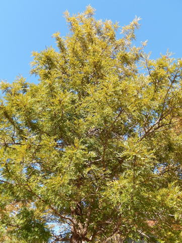 ハゴロモノキはヤマモガシ科の常緑樹である。原産地での樹高は25~40m程度となると言う。葉葉2回羽状複葉で、葉身の長さは15~25㎝程度となる。小葉は披針形で凡そ20対つく。葉裏には銀白色の絹毛を持ち、和名「ハゴロモノキ」の名の語原ともなっている。6月頃、長さ10~15㎝程度の総状花序を出し、筒型で橙黄色の小花を多数つける。 | |