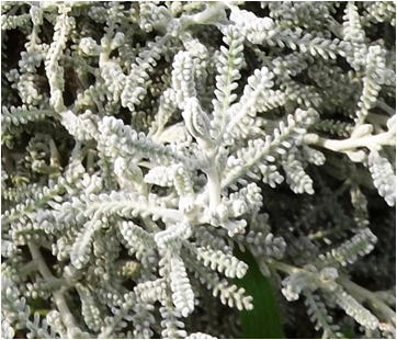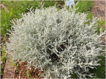 | 解説 | ワタスギギクは、キク科の常緑低木である。全草にサントリナオイルという香気成分を含み、香水用香料として用いられてきた。樹高は20~40」㎝程度。葉は銀白色、細かい羽状はで、対生し、綿毛で覆われる。6~7月頃に黄色い頭花を見せる。 | |