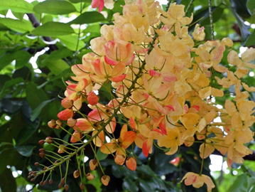 レインボウ・シャワーはジャケツイバラ科の常緑樹である。カッシア・フィストゥラ(ナンバンサイカチ)とカッシア・ジャパニカ(ピンクシャワー)との自然交雑種である。花色は朱橙色。開花期は6~8月頃 | |