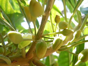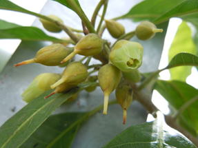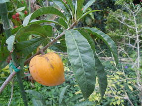 カニステルは、アカテツ科の常緑低木である。幹肌、葉姿、花等の様子は一見して柑橘類を想起させる。枝には鋭いトゲがある。花は蕾時は紫紅色を帯び開花時には白色となる。果実は、橙黄色で、径5~10㎝程度。果肉も濃い黄色で、果汁が殆ど無く卵の黄身のような味がすると言うので、エッグ・フルーツとも呼ばれる。生食以外に、パイやジャム等に加工利用もされる。 | |
