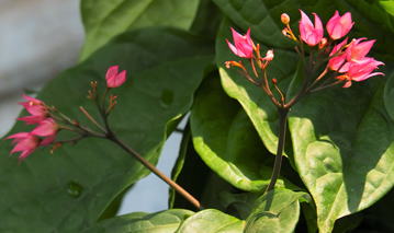 ベニベンケイカズラは、シソ科(←クマツヅラ科)の蔓性常緑樹である。蔓長は1.5m程度に。葉はほぼ楕円形で対生する。5~9月頃、茎(蔓)上部の葉腋から白い萼片に赤花をつける。蕾時には萼は白色だが、開花時には淡紅色へと変化する。花径は2㎝前後程度。本種は結実しないと言われている。 | |