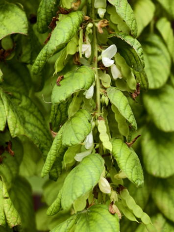 フィロディウム・ロンゴペスはマメ科の常緑樹である。樹高は1~3m程度となる。若枝は濃褐色のビロード状毛で覆われる。葉は3出複葉で枝に互生し、中央の小葉は長さ13~20㎝、幅3.5~6㎝程度長楕円形で、縁部は全縁、先端部は尖り基部では短い葉柄に連なる。側葉は、長さ3~4㎝、幅1.5~2㎝程度の幾分斜めの卵形となる。8~9月頃が開花の全盛期であるが、原産地ではほぼ周年開花するという。葉腋に径4~5㎜程度で白色~淡黄色の蝶形花を多数つける。花には、鱗状苞葉が重なり長く下垂する。花後には、長さ1㎝程度の莢果をつけ、内部に種子を3~5個持つ。 | ||