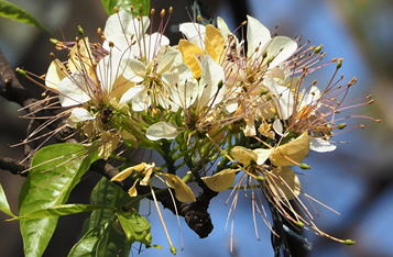 | 解説 | ギョボクは、フウチョウソウ科の落葉樹である。我が国では鹿児島県以南に自生が見られ、特にツマベニチョウの食草として知られている樹木である。幹は直立し樹高は4~8m程度に。葉は3出複葉で枝に互生する。小葉は披針形で、全縁、鋭頭。3~4月頃。枝先に総状花序を出し、掲載した写真に見られるような花を開く。特に雄蕊や雌蕊が長く目立つ。9月頃に卵形の液果が赤熟する。 | |
