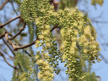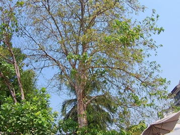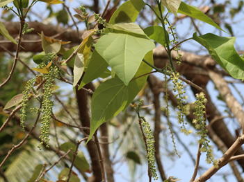 ニセホワイトチークはトウダイグサ科の落葉樹である。本種は、熱帯アジアの概して川沿いに自生する樹種である。樹高は10~20m程度となる。葉は、長さ3~7㎝の葉柄を持った卵形で、長さ7~17㎝程度となり、基部は心形、先端は鋭頭となり、枝に対生する。原産地では12~3月頃に開花し、雄花は花弁を持たない淡緑色で、4~19㎝程度の総状花序を1~3本下垂する。雌花は単生し、3~5個の萼片を持ち、花後には径2~4㎝程度の球形朔果をつける。外果皮は厚みのある肉質である。 | |