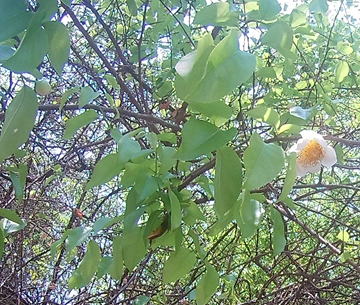 | 解説description | オンコバ・スピノーサは、ヤマギ科(←イイギリ科)の半落葉樹である。本種は、アフリカ大陸の北アフリカ~南アフリカまでの大陸東岸に広く分布する。概して川沿いの谷筋や岩野多い丘陵地、比較的乾燥した森林地帯~サバンナに自生する樹種である。樹高は5m程度となる。幹は直立し上部でよく分枝をする。枝には鋭い刺がある。葉は、長さ5~6㎝程度の卵形で、縁部には鋸歯を持ち、先端部は尖り、基部では葉柄に連なり枝に互生する。葉は、薄い革質である。原産地では、9~12月頃に開花し、枝先の葉腋に径5~8㎝程度で、萼片5個、花被片(白色)7~13個、中央の雄蕊(黄色)多数の花をつける。開花時には芳香を放つ。花後には、径2~3㎝程度の球茎の液果を黄褐色に熟す。果実の先端部には花柱が残存する。 | ||