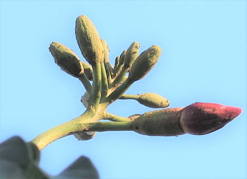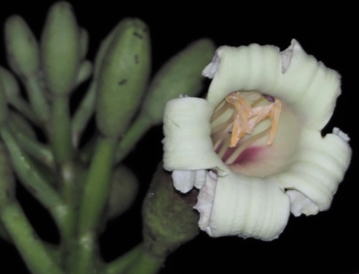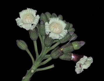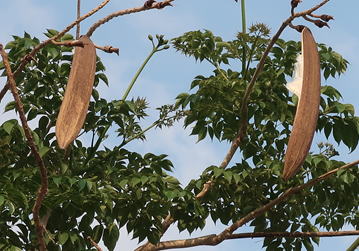 ソリザヤノキは、ノウゼンカズラ科の落葉樹である。樹高は5~15m程度となる。葉は2~3回羽状複葉で、小葉は長さ5~13㎝程度の長卵形で、3~5対つく。6~7月頃、枝先に総状花序を出し、径6~10㎝程度の肉厚で大型の筒状花を多数つける。花冠は5裂し、裂片は外方に巻き込む。花は、一日花で、夜間に開花し、翌朝には落下してしまう。花後の果実は40~120㎝程度の莢果で、透明で膜質な翼(長さ6~7㎝程度)を持った種子を内包する。種子は、莢が裂開すると、風に乗り、滑空する。 | |