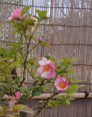 マツカサはツバキ科の常緑樹である。本種は、サザンカの園芸品種である。かつては、関西地方では「鳳凰錦」名で流通していたが、関東地方にも同名種が存在したために、「桃山」と改名されたようである。樹高は2~3m程度となる。葉は葉柄を持ち、楕円形~長楕円形で、縁には浅鋸歯があり、先端はほぼ鈍頭に近いが幾分尖りを見せ、茎に互生する。葉質は厚味があり、表面には光沢がある。11~1月頃、枝先の葉腋に桃色地に白斑模様の入る一重咲きの中輪種である。 | |