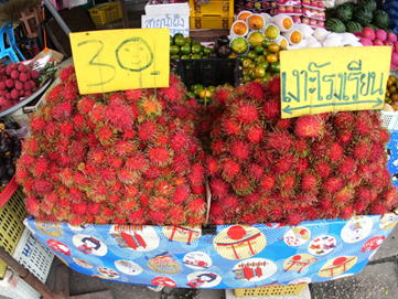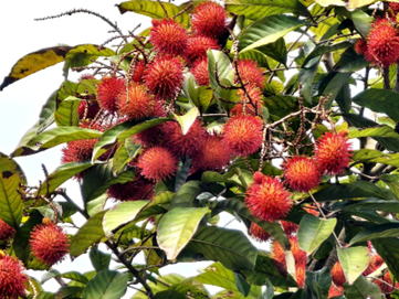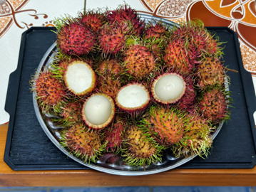 ランブータンはムクロジ科の常緑樹である。樹高は10~15m前後程度に。果実は鶏卵大で、幼果は緑色だが、やがて濃赤色、黄赤色、緑赤色等に熟す。表面は長い毛(1~1.5㎝程度)で覆われている。果肉は白色の半透明である。肉質は多汁質で甘味が強い。本種は、実生苗からは酸味が強い果実が得られてしまうため、品種の良い樹木の枝から取り木や挿し木によって栽培されている。また、本種は気候の関係から我が国では栽培されていることはない。 | |
