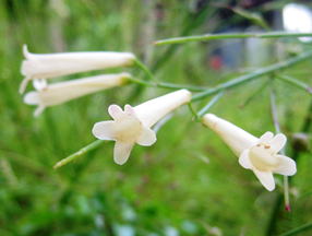 ハナチョウジはオオバコ科(←ゴマノハグサ科)の常緑樹である。樹高は1~2m程度。葉は細い針状で茎に対生する。我が国では5~9月頃に開花するが、熱帯地方では周年開花するという。花は、長さ2.5㎝程度の筒状花である。花冠は4列する。非常に細い枝に多数の花をつけるものだから、写真に見られるように、枝そのものが垂れ下がってしまう。我が国へはかなり以前に渡来していたようであるが、熱帯性の植物でもあり、加えて、吊り鉢という栽培法が近年になるまで普及しなかったためにあまり栽培されなかった植物である。花色は赤色以外に、黄花や白花もある。 | |