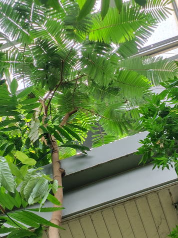 ネジレフサマメはマメ科の常緑樹である。樹高は18~24mに達し、株基に大きな晩婚を持つ。葉は、2回羽状複葉で20~35対の羽片を持つ。小葉は、幅2~3㎜程度の楕円形で、先端部は微突形となる。4~7月頃に開花し、洋梨形の花序を下垂し、白色の小花を多数つける。莢は長さ40~50㎝、幅5㎝程度で捻れた形状で、房状に下垂し、12~18個の大粒種子を内包する。 | |