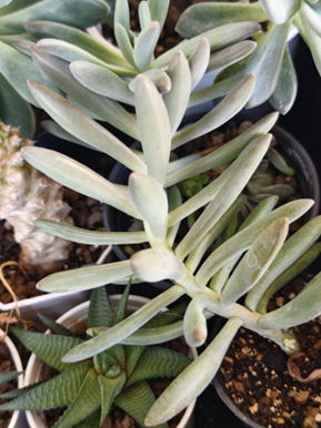 セイリョウトウは、キク科の多肉植物である。原産地(南アフリカ・ケープ州)では、乾燥地帯に小灌木状に群生しているという。樹高は1m前後程度となる。茎は、径8~12㎜程度で、多肉質であり、脆く、途中で分枝をし、直立~傾斜しながら立ち上がる。葉は、長さ8~15㎝、幅7~9㎜程度で、最大の厚みは15㎜程度の肉質で直立し、側方に扁平し、先端部は鋭頭となる。葉は、粉状灰白色で、蝋質、縦縞を持つ。開花時には、無花弁の白色の花をつけ、花後には軟毛状の果実をつける。 | |